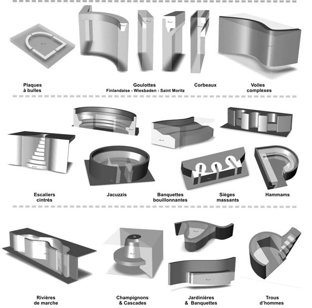 · Goulottes, Corbeaux droite, courbes et à pente variable, Plaques à bulles, Incorporations buses et spots, Hublots